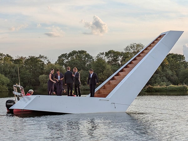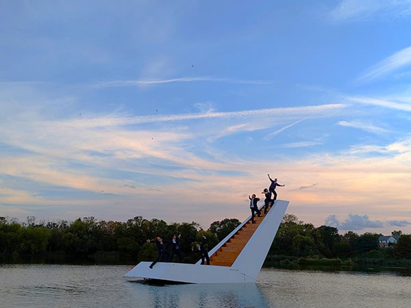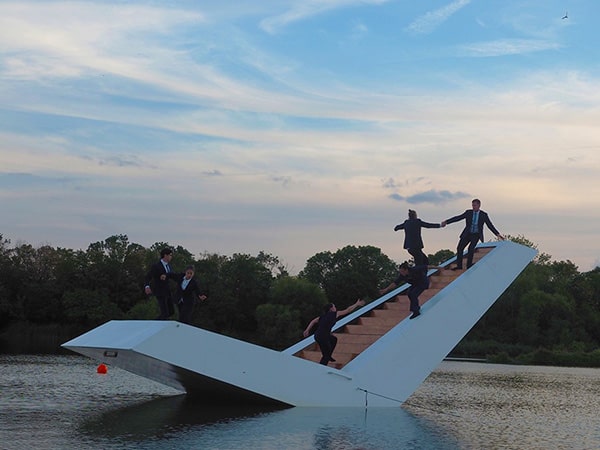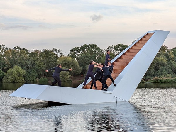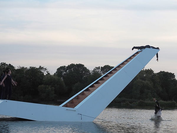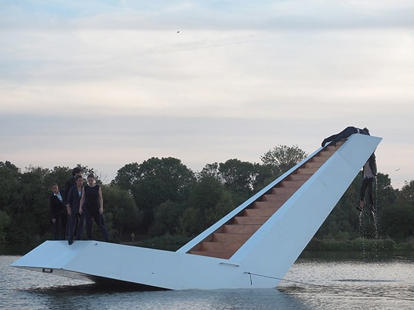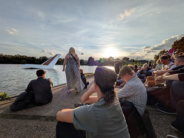 夏の日差しの残る夕暮れ時の9月初めのこの日、向かったのはロンドンの極東テムズミードの町にあるBirchmere Lake。以前にもコラムで紹介した夏の終わりのパフォーマンスアートの祭典、Greenwich+Docklands International Festival (GDIF) の一環です。普段は静かなフナなどの釣り場としても知られるBirchmere Lakeですが、この日は湖のコンクリートの階段が野外劇場の座席に変身。湖の中央には階段のある不思議な白い彫刻のようなオブジェが浮かんでいます。