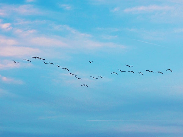 クジラのような大きな舞台が左右に水しぶきを上げて揺れ動く様子にただならぬものを感じたのか、水鳥たちもその様子をうかがいに観客の頭上を旋回し始めます。