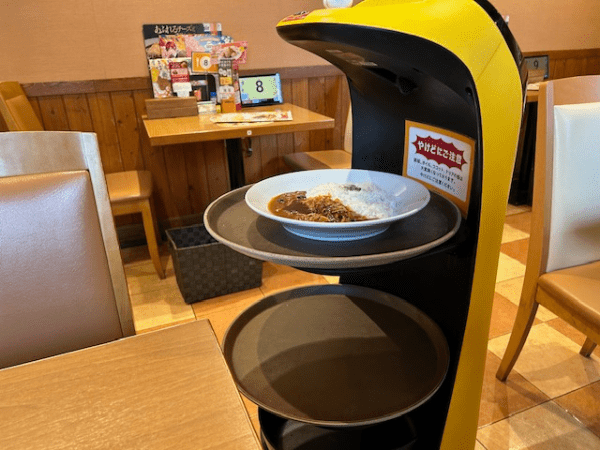 日常生活にはもうすっかりロボットが定着しています。僕は365日ご飯は外食なのですが、この数年で多くの飲食店がタブレットかQRコードでのモバイルオーダーになりました。そして登場するのが配膳ロボット。僕がよく行く近所のファミレス(ココス)でも彼ら(彼女ら?)は大活躍。見た目はヒト型ではないのですが(※写真①)、妙にかわいいのはなぜなのか。しばらく観察してみて気付いたのは彼らの人間っぽさです。急に子どもが近付いて触れたりすると立ち止まりオドオドします。彼らどうしがすれ違うときは、お互いに譲り合って時間がかかったりして、なんだかちょっとマヌケなのです。あ~~、この感覚は昔どこかで味わった気がします。