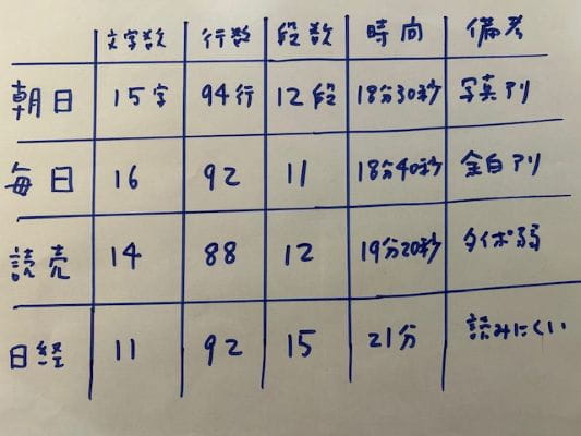 4紙各々特徴が異なります。中身は完全に一緒なので、これはもう面担当者の腕の見せ所、競い合い。僕の本業の広告の世界だとAD(アートディレクター)の技量の差が一目でわかってしまうようなものです。担当者のご苦労お察しします。この際なので全紙の文字を数えてみました。そして各々黙読しました(※写真②)。