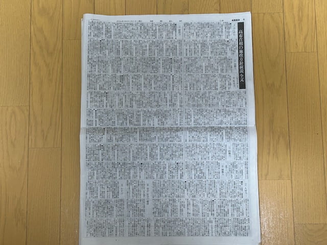 毎日(※写真④)は可もなく不可もなく。読売(※写真⑤)は文字の書体が長文を読むにはややしんどい細さ。そして日経(※写真⑥)は最後に読んだので消耗もありましたが、辛かったです。一行が短ければいいというわけでもないのですね。勉強になりました。