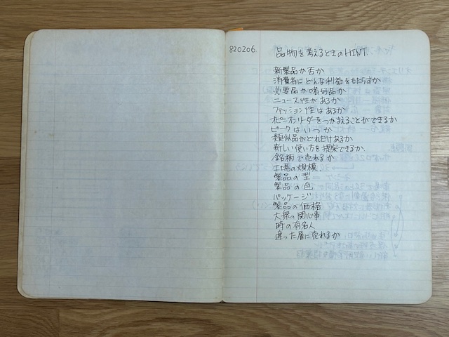 なぜなんだろう?それは、横書きは左から右に書くのだから左開きなのが至極当然というごもっともな意見で終了のようですが、いやいやそうでもないと僕は強く思うのです。中学の頃がどうだったのか当時のノートが見つからないのでわかりませんが、高校の頃から僕はノートは左頁は書かずにあけて右頁だけに書いています。こんな感じ(写真⑤)。因みにこれは10代の頃コピーライターの養成講座の生徒だったときのノート。まじめに書いているなぁ、お恥ずかしい。