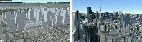 「PLATEAU」の三次元都市モデル。建物形状のみ(左)とテクスチャ付き(右)で、都市の骨格を再現