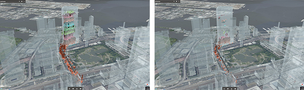 あとは本当に地味な話ですが、操作性やデータの重さも大きな課題でした。三次元になるとデータ量が増えるので、時間軸で区切ったり、扱うデータを小さく分けたりしながら、PCの性能や動作環境に合わせて最適化を進めていました。人が多い都心エリアは重くなりがちで、郊外の街は比較的扱いやすい、といった違いも実感しましたね。