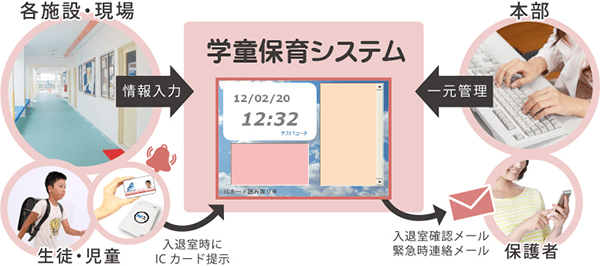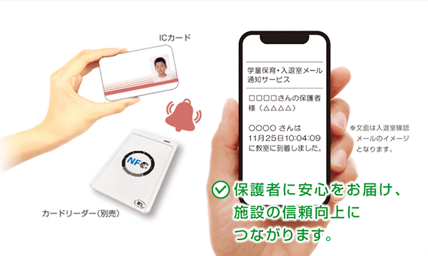 その学童保育での児童の出席管理をするために、お子さま自身がカードをかざすと、保護者にメールが飛び、お子さまが学童保育に来たという通知がいきます。帰宅時も同じく、カードをかざすことで、今から帰るという連絡になります。