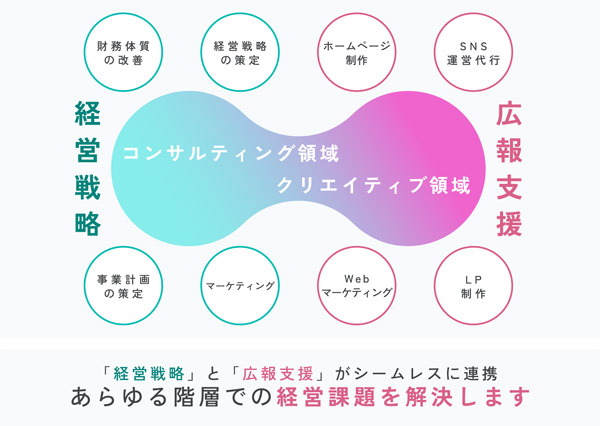 そこで、私たちがそれぞれの専門性を活かし、「経営戦略」と「クリエイティブ領域」の両面から一体的に支援できる会社を設立することで、より多くの課題をより的確に解決できると考えたんです。