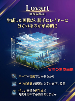 「Nano Banana Pro」は単体でも優れている生成能力を有していますが、Lovartのプラットフォーム上で運用することで、デザインワークフローにおける実用性が飛躍的に向上します。Lovartは、生成された高品質な画像を単なる「静止画」として終わらせず、後工程で「編集可能なデザインコンポーネント」として活用できる環境を提供します。