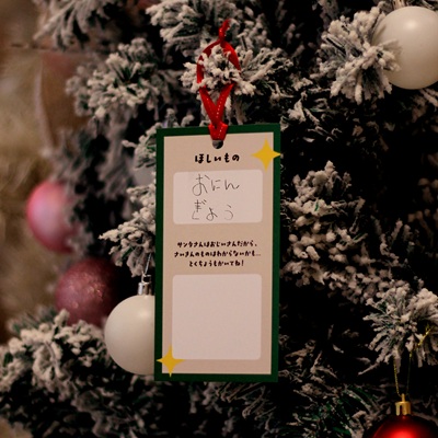 お子さんに「ほしいもの」を書いてもらいましょう。最近の多様な商品展開に対応するために、特徴を書く欄なども載せています。(おなじキャラクターのゲームでも沢山種類があったりして大変ですよね…!)