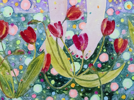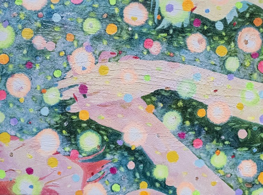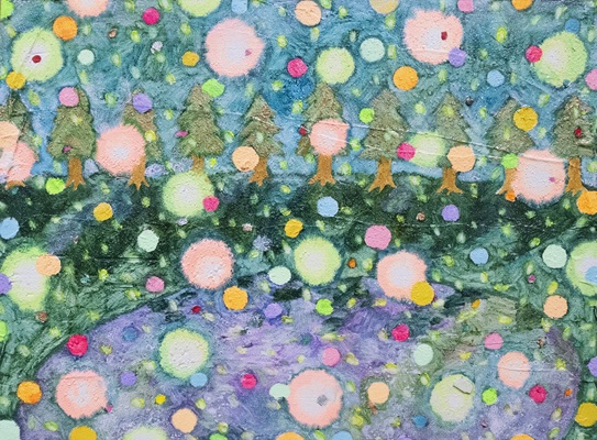 その画面には、すべての動植物が対等にひとつの生命として描かれます。草木や色彩の粒がいっぱいに広がり、動きを感じさせる構図の中に、静謐さの奥に強い光を宿すまなざしの人物や、生命力あふれる植物が印象的に佇み、“内と外”、“動と静”が交わる世界が立ち現れます。