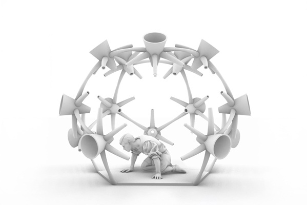 鑑賞者の位置や歩行に応答して音場が変化するインタラクティブ音響システムを用いたサウンドインスタレーション。