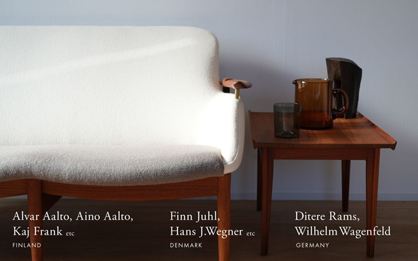 本展では、ドイツ(ディーター・ラムス、ヴィルヘルム・ワーゲンフェルド)、フィンランド(アルヴァ・アアルト、アイノ・アアルト、カイ・フランク)、デンマーク(フィン・ユール、ハンス・J・ウェグナー)ら、1930~1950年代のモダンデザイン黄金期を築いた巨匠たちの家具や雑貨を厳選し、展示販売いたします。
