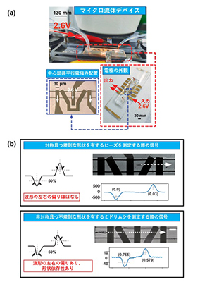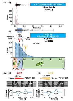 非対称型電極と採用した細胞インピーダンス計測システムを開発し、ユーグレナの形状を簡便に識別することに成功しました。これまでのインピーダンス計測手法では、電極の間に均一な電場を作り、それを通過する細胞のインピーダンスを分析します。この既存の方法では、対称且つ規則的な形状を持つものを計測対象としており、電場を通過する時間をもってサイズを測定します。しかし、ユーグレナのような、対称性が低く、不規則な形状である細胞のサイズ・形状の測定には不向きであったことから、本研究グループは、通常の電極間に傾斜電極を追加し(図2(a))、電場に進入した対象の流路中の位置情報を信号の振幅で、大きさを信号幅で、形状を信号の立ち上がりと立下りのズレ、すなわち偏心率(Tilt index))として計測しました(図2(b))。その結果として、電気インピーダンス測定だけで細胞形状の情報を得ることができるようになりました。