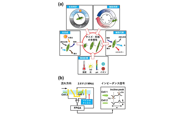 近年、地球温暖化対策を産業によって解決するべく、植物や微生物が行う光合成で二酸化炭素を活用し有用物質をつくる研究が進んでいます。なかでも多糖類を効率よく産生するユーグレナは、健康食品、化粧品、バイオプラスチック、バイオ燃料の原料や、二酸化炭素の処理などで有望視されていますが、より産業で活用するには、より生産性の高いユーグレナ株の選別がその一助となります。効率よく光合成を行うには、光を有効に使う必要がありますが、それにはユーグレナの大きさや、細い・太いといった形状が重要なファクターです。ユーグレナの形状は、ユーグレナ自体の持つ生体時計、代謝、細胞周期、培養環境と密接に関係します(図1(a))。このため、ユーグレナの形状をいかに高速かつ大量、正確に識別できるかが、より生産性の高いユーグレナを得るための重要課題になります。これまで、顕微鏡下での光散乱を用いて画像を取得するなどの光学的な手法で個々のユーグレナの形状を識別していましたが、低コスト化や処理能力の改善、小型化、自動化による培養槽組込みなどが研究において望まれていました。今回開発したシステムは、マイクロ流体デバイスを用いて、連続的に複数のユーグレナの形状を瞬時に判断します。本システムでは電気的に測定を行うため、顕微鏡のような光学的装置は必要ありません。このシステムでは、流路チャネル内に特殊な構造のマルチ電極を配置し(図1(b))、マルチ電極上をユーグレナが横切る時の信号の持続時間、振幅、波形から、ユーグレナの形状を高速で連続して識別できるようになりました。時間あたりの処理能力としては、毎秒1,000細胞の高速で識別することができます。さらに、ユーグレナ以外の藻類や微生物の形状判断に応用可能なことと、小型で、かつ連続して形状を識別することができるデバイスの特徴を生かし、フィールドで使用できる可搬可能なシステム構築や、培養槽での藻類の常時モニタリングへの応用が可能となり、急速に高まっている藻類産業(スマートセル産業)への展開が期待されます。