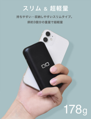 本体は手になじむ曲面設計を採用。卵約3個分と超軽量 (約178g)で、持ち運び・収納しやすい小型モバイルバッテリーです。機内持ち込みも問題ありません。