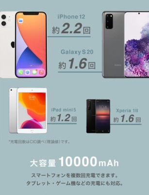 iPhone 12/約2.2回、Galaxy S 20/約1.6回、iPad mini5/約1.2回、Xperia 1ⅱ/約1.6回など、スマホを複数回充電できます。スマホ・タブレットだけでなく、ゲーム機などの充電にも対応しています。
