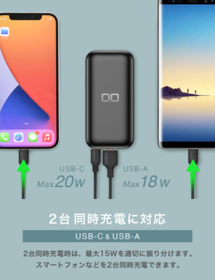 USB Type-C、Type-A両ポートを使った2台同時充電に対応。本体への蓄電も最大18Wの急速蓄電に対応しているので、約3時間でフル充電が行えます。付属品としてPD充電に対応したUSB Type-C to Type-Cケーブルを同梱しているので、すぐに急速充電が可能です。