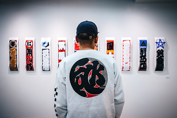 17世紀の江戸時代を発祥とする、提灯、火消し半纏や祭り、仕事半纏、千社札などに見られる、書をディフォルメすることで生まれた伝統的な図案文字 “江戸文字”。西洋からの影響を受けていない庶民の美的感覚によって構築された、これら文字文化の芸術的価値を、世界で最初となる日本オリジナルのグラフィティ(ストリート)アートとして位置付け、アルファベットを漢字のパーツとして構築したオリジナルの江戸文字を、グラフィティアートやポップアートなどのテクスチャーを用い表現した唯一無二の<Kanji-Graphy/カンジグラフィ)シリーズ作品で人気を獲得しました。