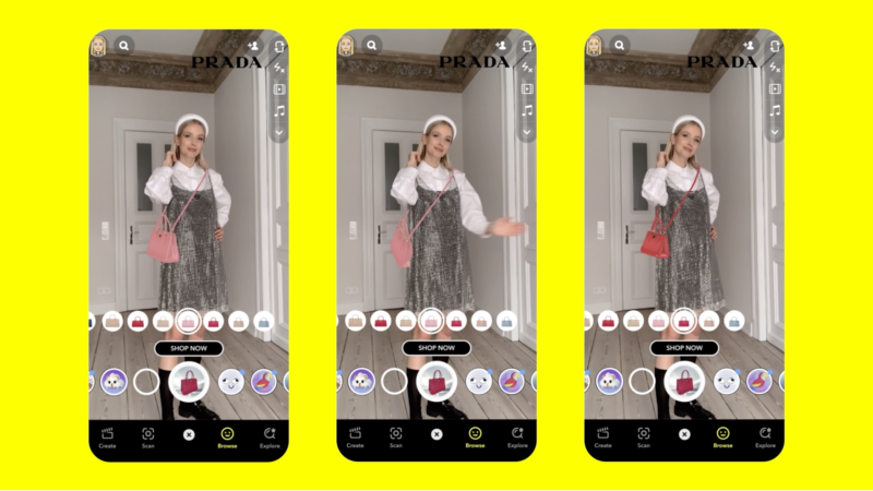 AR 試着事例:PRADA のバックの試着、Dior のスニーカーの試着、Gucci のスニーカーの試着など