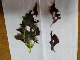 ところで、このところ私を悩ませているのがバッタ(らしき生きもの)である。いつの頃からか、水まきをするとぴょんぴょん飛ぶコが出てきて「ん?」と思ったら、小指の爪ぐらいのこどもバッタだった。「かわいい♪」と思ったものの、みるみるうちに穴の開いた葉っぱが増えていった。