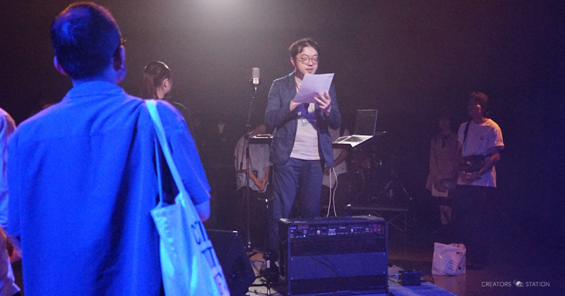 まずはバンド「WOos」の新曲「City Boy Dance」から。全方向からボーカルのウィスパーボイスに重なるようにそれぞれの楽器音が降り注ぐ。観客はおのおのが好ましい「位置」と「音」を見つけに旅に出る。客席で座って聞くのが当たり前と思っていた音楽は、自ら掴み取りに行く音楽に変わっていく、面白い。