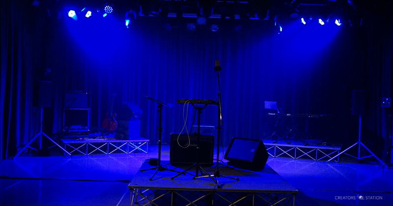 通されたのは地下1階のスタジオ。本イベントはJUN MUSICと城西国際大学メディア学部滝口ゼミによる産学共同イベントであることから学生スタッフがメインで配置されている。映画やドラマの撮影実習で使用されるというスタジオは、小さなライブハウスほどの空間。センターには1本のスタンドマイクが置かれており、おそらくここにボーカルが立つのだろう。しかし客席はない。スタンドマイクを取り囲むようにドーナツ状の空間があり、その外側にギター、ベース、ドラム、キーボードが放射線状に配置されている。このドーナツ状の空間が、今日の観客席のようだ。