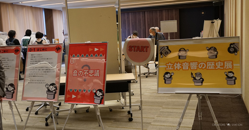 音のゲリラ豪雨に呆然とする間もなく5階へ。こちらでは、紀元前ギリシャの神々の戦いから始まり現代に至るまで、人と音の関わりの変遷をパネルで展示する「立体音響の歴史展」、デジタルクルーズ株式会社とJUN MUSICが共同開発中のオフィス環境を音響で最適化するモジュール「オフィスサウンドデザイナー」など、立体音響に関する展示作品が並ぶ。