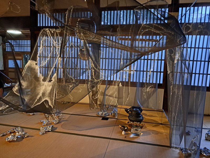 長久寺の中では茶湯活動家の住田薫さんが、身近なものの美を重んじる「侘茶(わびちゃ)」の世界を、網戸やアルミホイルなどを使った茶室で表現しました。