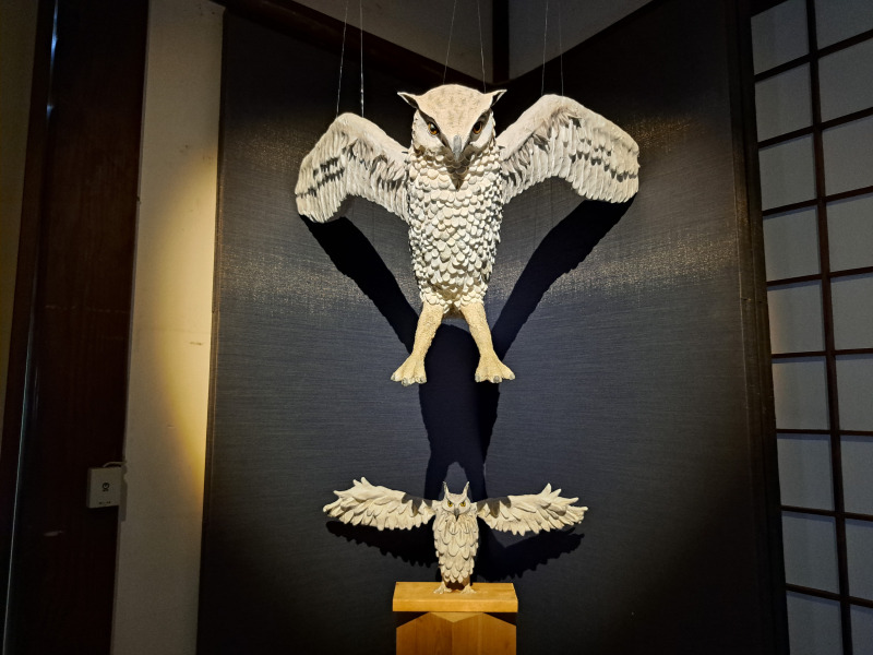 迫力のあるミミズクは発泡スチロールと紙粘土でできているとは思えないほど、精巧で今にも羽ばたきそうです。