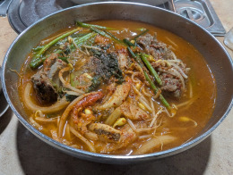 後で調べたら、ヘジャンクㇰにソンジ(牛の血)は不可欠な素材ではないとのこと。たまたまソウル地方で牛の血入りヘジャンクㇰが有名なだけで、豚の背骨なり鱈なり、地方別に様々なヘジャンクㇰがある。今回、私が食べることになった豚の背骨入りはピョヘジャンクㇰ、と呼ぶとのこと。