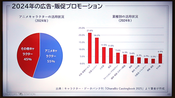 アニメの二次利用市場を見ると、国内のキャラクター商品市場は2020年にコロナ禍の影響で底を打って以来年々拡大を続け、2024年は1兆6860億円となりました。作品別に見ると『ポケットモンスター』、『それいけ!アンパンマン』、『ちいかわ』、『プリキュア』シリーズ、『すみっコぐらし』などキッズファミリー向けが依然として強く、2024年の商品化におけるシェアは79.6%がキッズアニメで、20.4%がコアファンに向けたアニメでした。ただ、コアファン向けアニメの比率は、2018年には12.6%であったことを考えると、年々増加の一途をたどっています。