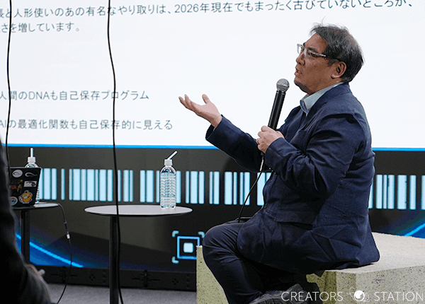 今回はAIに関する内容ということもあり、櫻井氏が事前にChatGPTに相談して作ったトーク構成をもとに”人間がAIに操られて話す”、人形使い的な構図という興味深い趣向で対談が行われた。