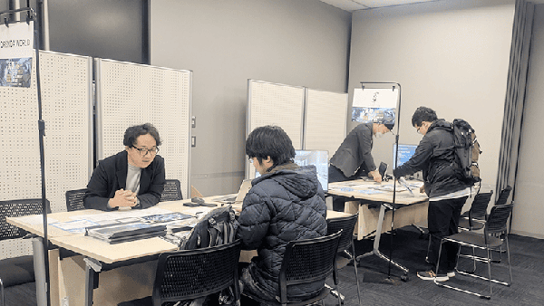 当日は22名が参加し、会場内では活発な交流が行われました。企業ブースでは就職相談に加え、ポートフォリオの評価や作品への具体的なアドバイスが行われ、参加者は制作の方向性やスキルの磨き方、業界で求められる人物像などについて熱心に質問していました。