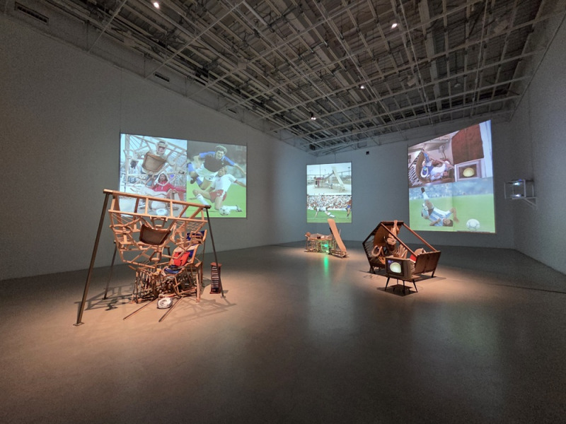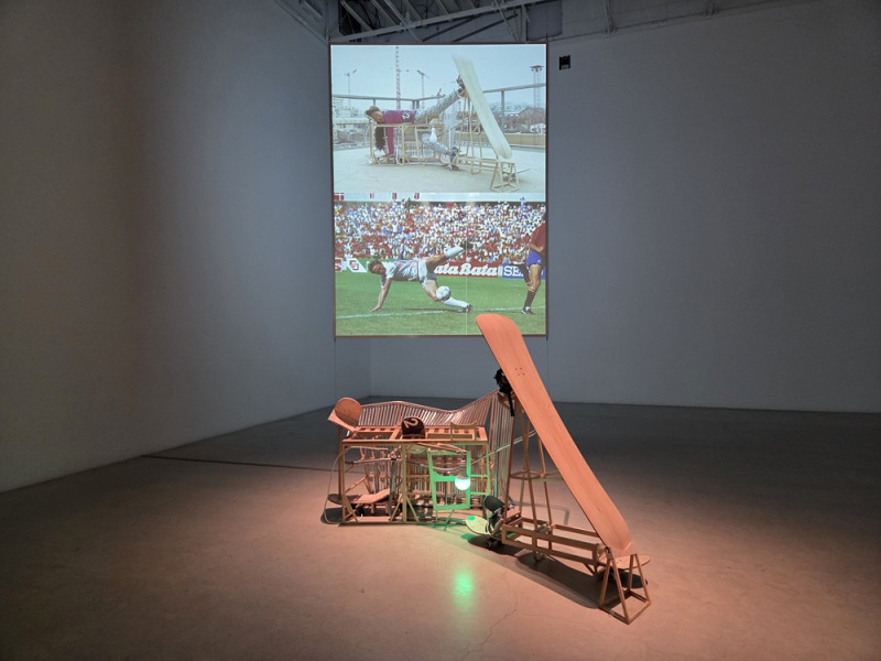 スポーツ選手の決定的な瞬間を収めた写真を再現するという作品なのだが、写真のポーズを人間が意図的に模倣するための彫刻と、実際に人が彫刻に乗り込み(?)再現する様子を収めた映像、そして再現映像を収録する際に同時に録音された周囲の環境音で成り立っている。